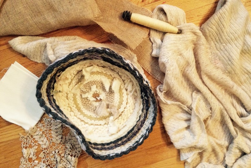 Wrapping the outside of the now bowl in my old worn sweater, allowing for waves here, ripples there, I feel the comfort I was longing for when I first began those initial rounds. Gentle stitching with the woolen yarn offers chances to start anew, start anew, as weak spots made for unplanned breaks.
