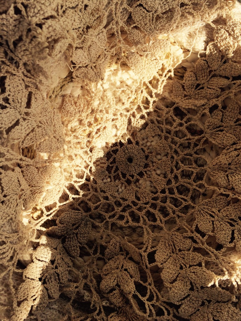 My grandmother’s very old doily, worn, strained, yet saved.