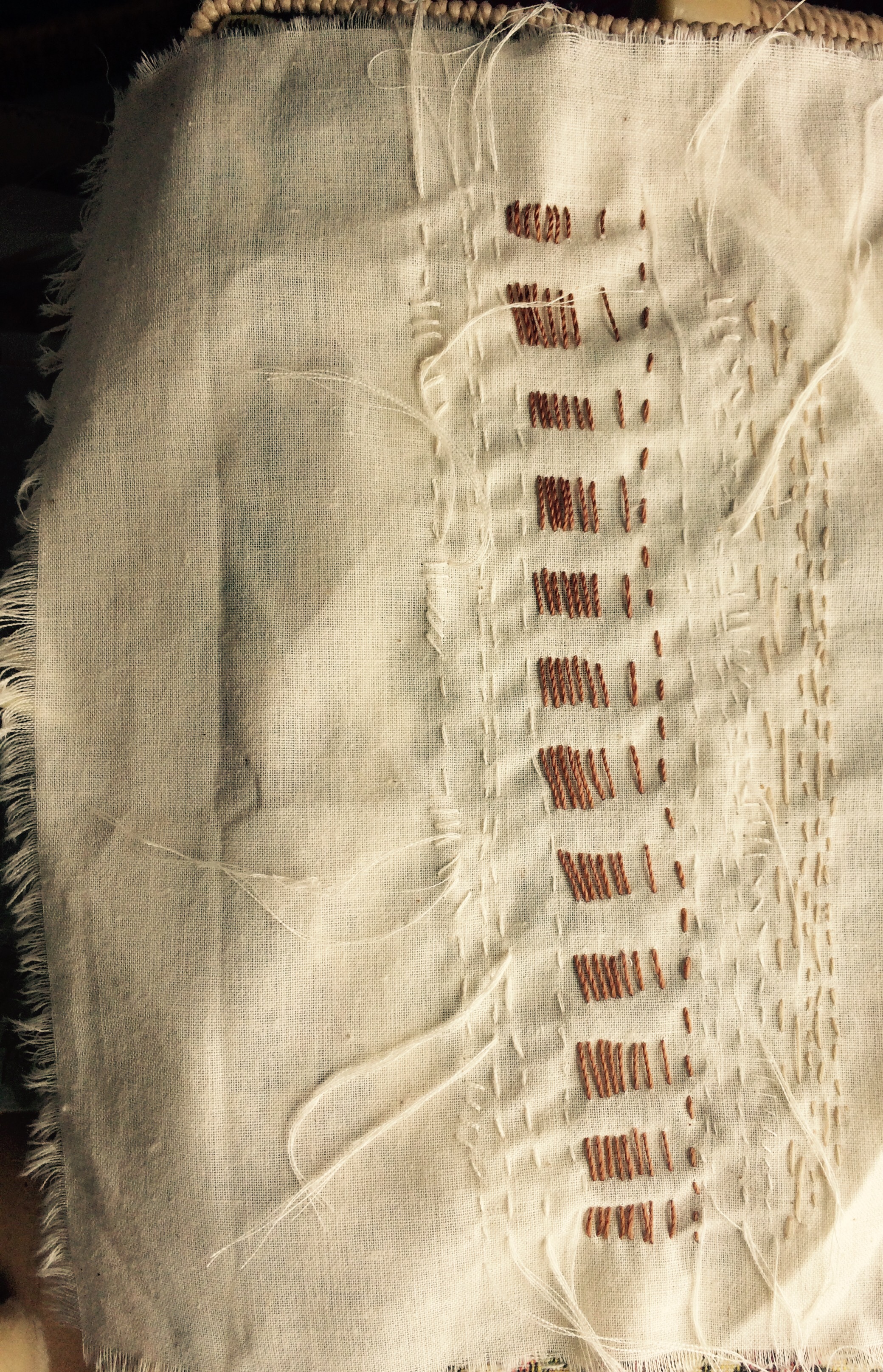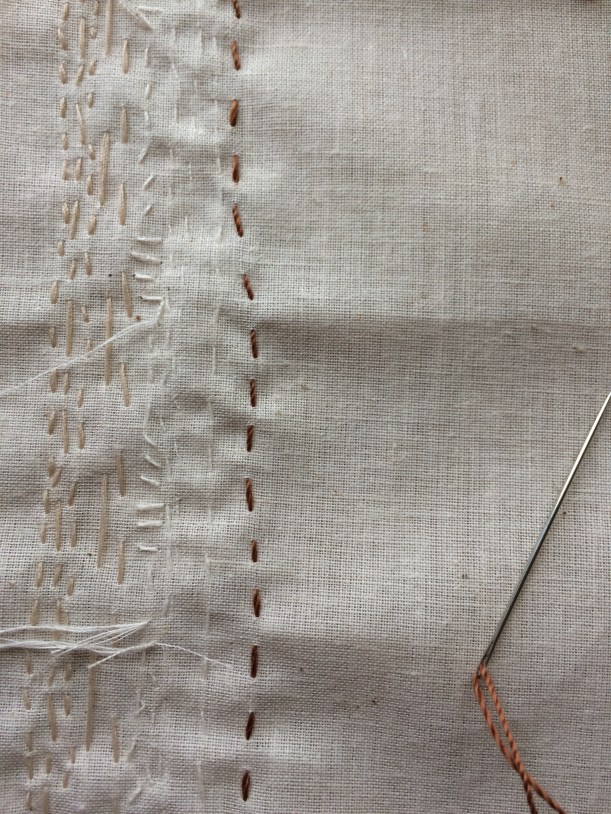 Here are the two new stitches: sorbello and seed. Practice using small squares of fabric, maybe one on its own and one in layers. Use thread that calls to you and let yourself enjoy the process without the sense of rushing or pressure urging your hands.
