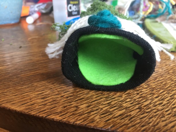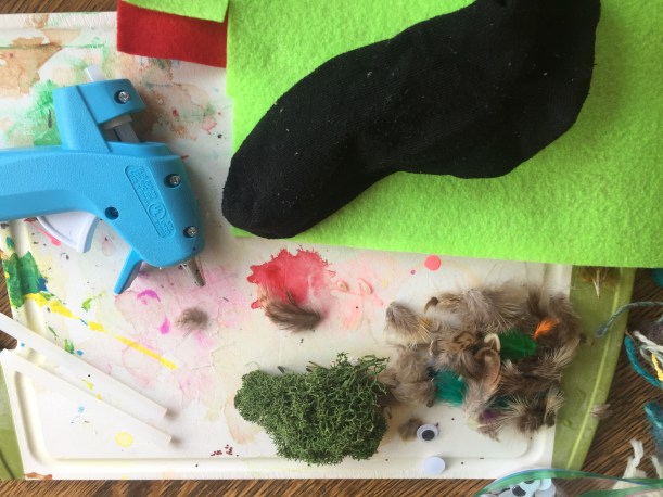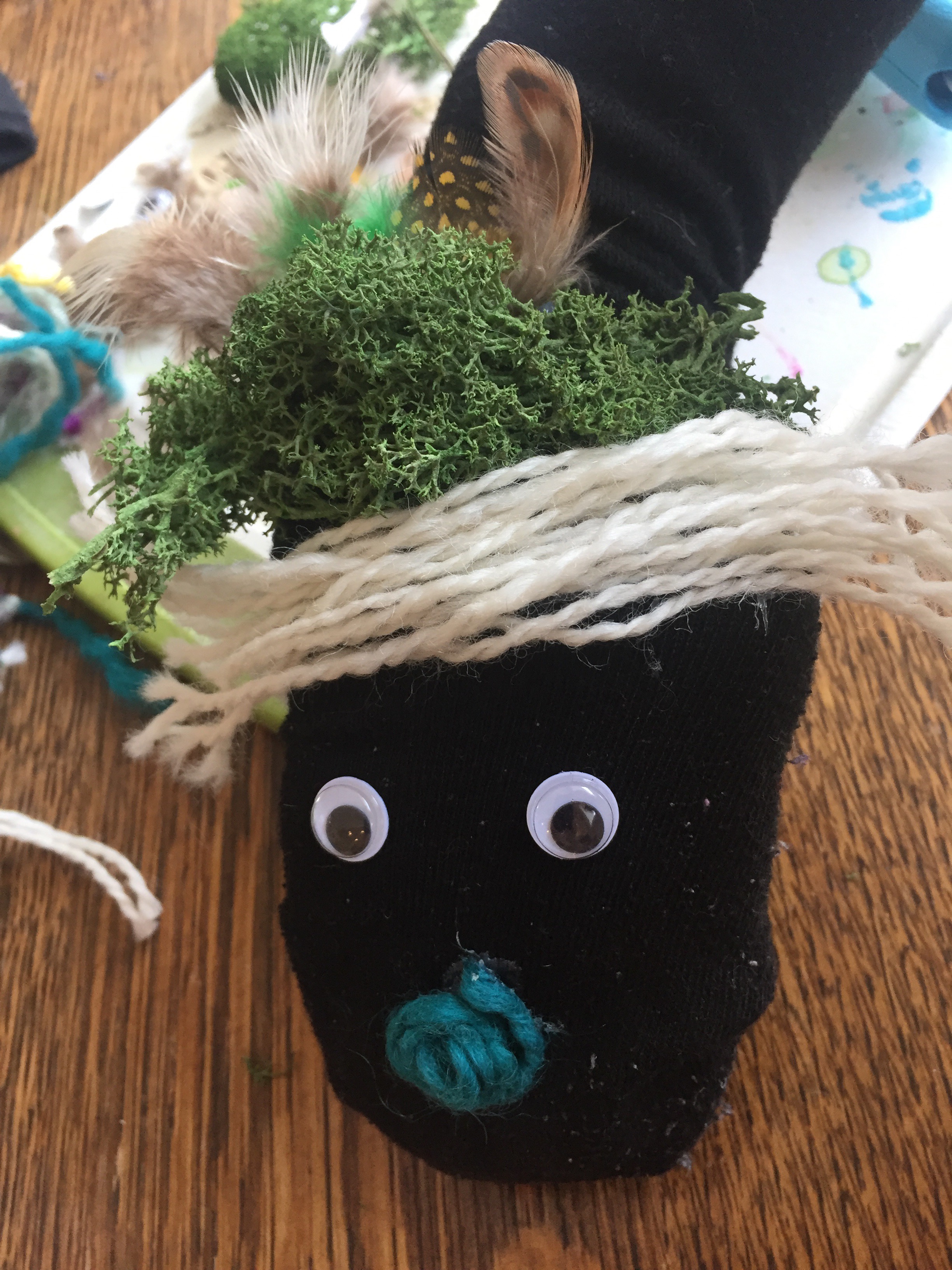 #5: Notice the personality that is already evident! Amazing, what eyes do. 👀 Start adding whatever you want to your puppet, being careful not to overglue. You don’t want the sock to stick to itself. On mine I knew mossy hair was necessary, and feathers.