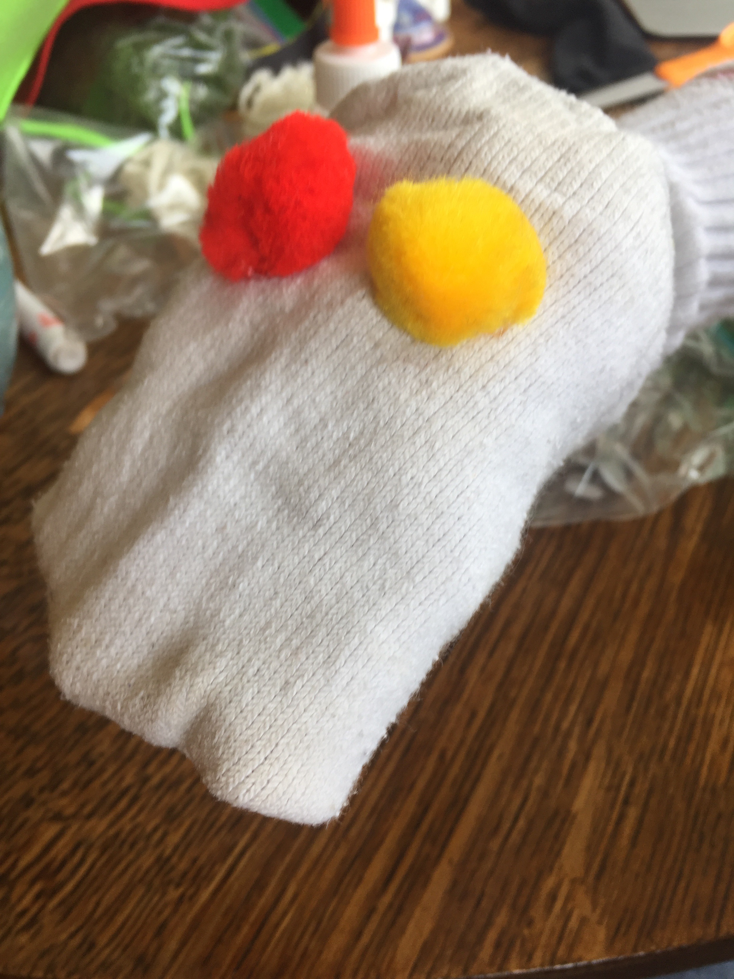 #4: Arrange sock on hand. I find that the heel of the sock fits nicely over the knuckles. When you open you hand, keeping your fingers together and away from your thumb, you can tuck the extra sock fabric that would otherwise be around your toes, into that space, creating the mouth. Close your hand, holding the mouth in place, and glue on the eyes where you want them. Then, gently remove the sock and lay it on the table.