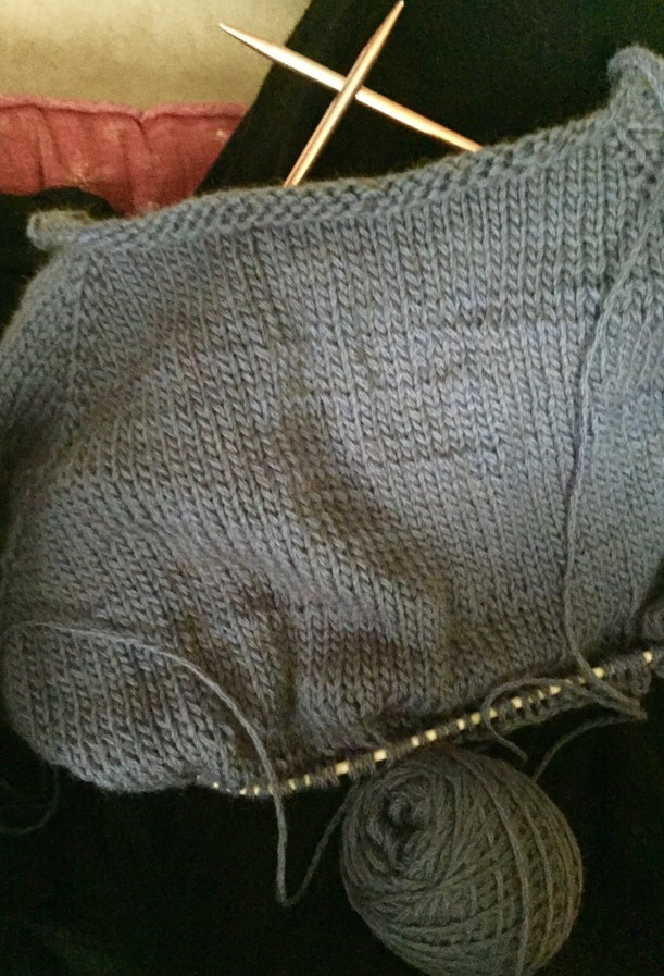 Ten or so inches of body~ the steady marathon part of the sweater. The part of the project I can easily take with me anywhere because I won’t have to keep track of anything, count anything. Beta wave knitting. Ahhh…