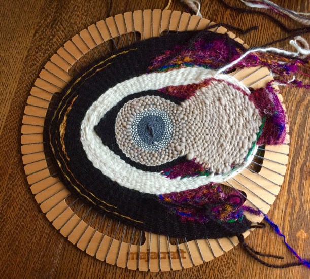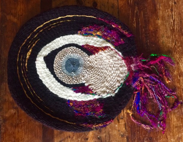 I finished my circular weaving project and what started out as one idea evolved into a moving symbol for me. Wild bird flying into golden fire 🔥.