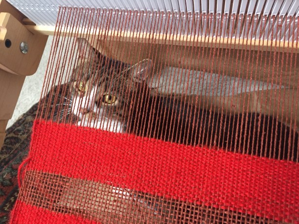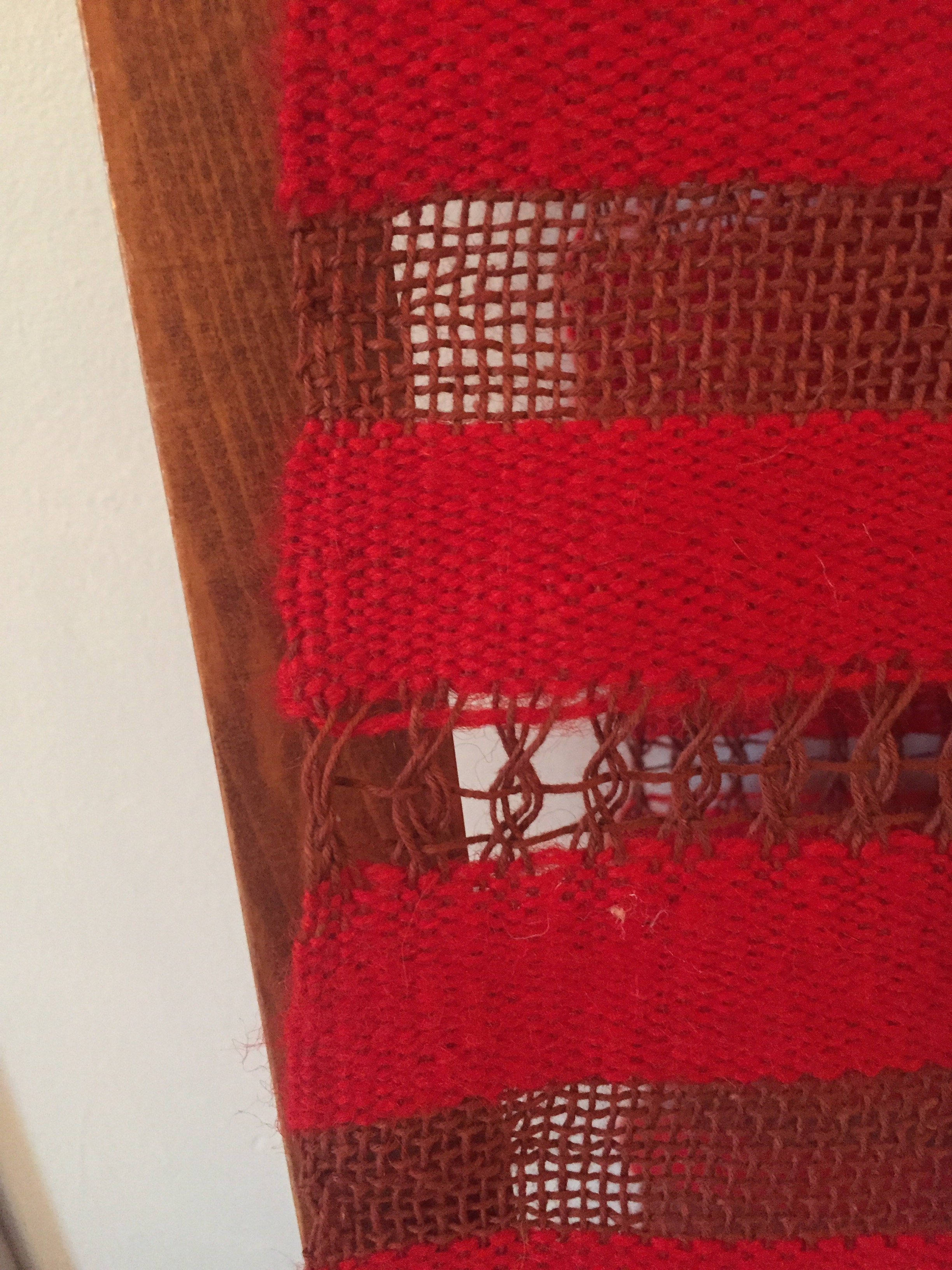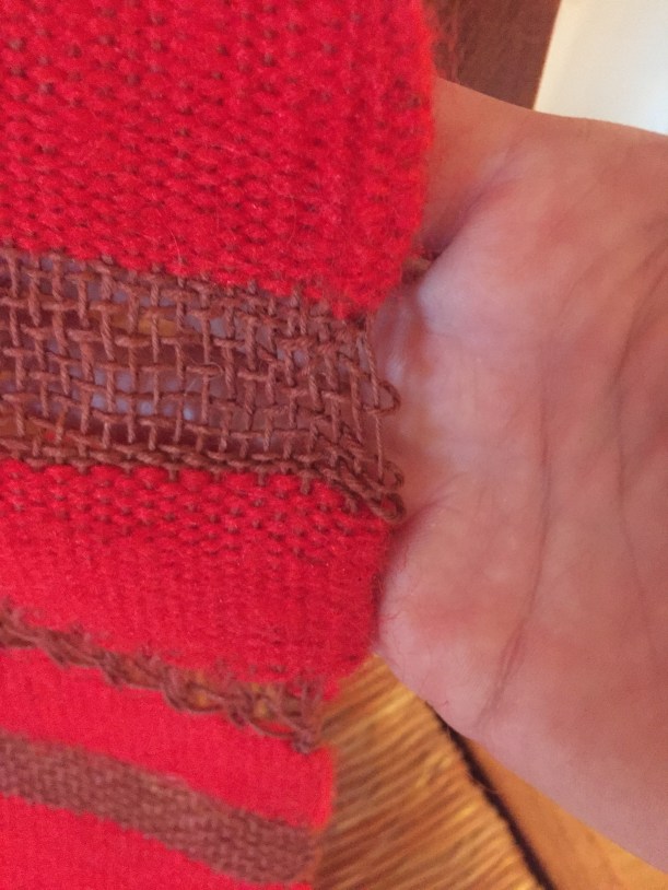 When I had to switch colors (according to my own pattern; I’d arrange the color changes much differently if I were to make this again) I tried securing the loose threads in the loop of the weft as it was going back through the warp. That worked out pretty well. Wish I’d have figured that out sooner!