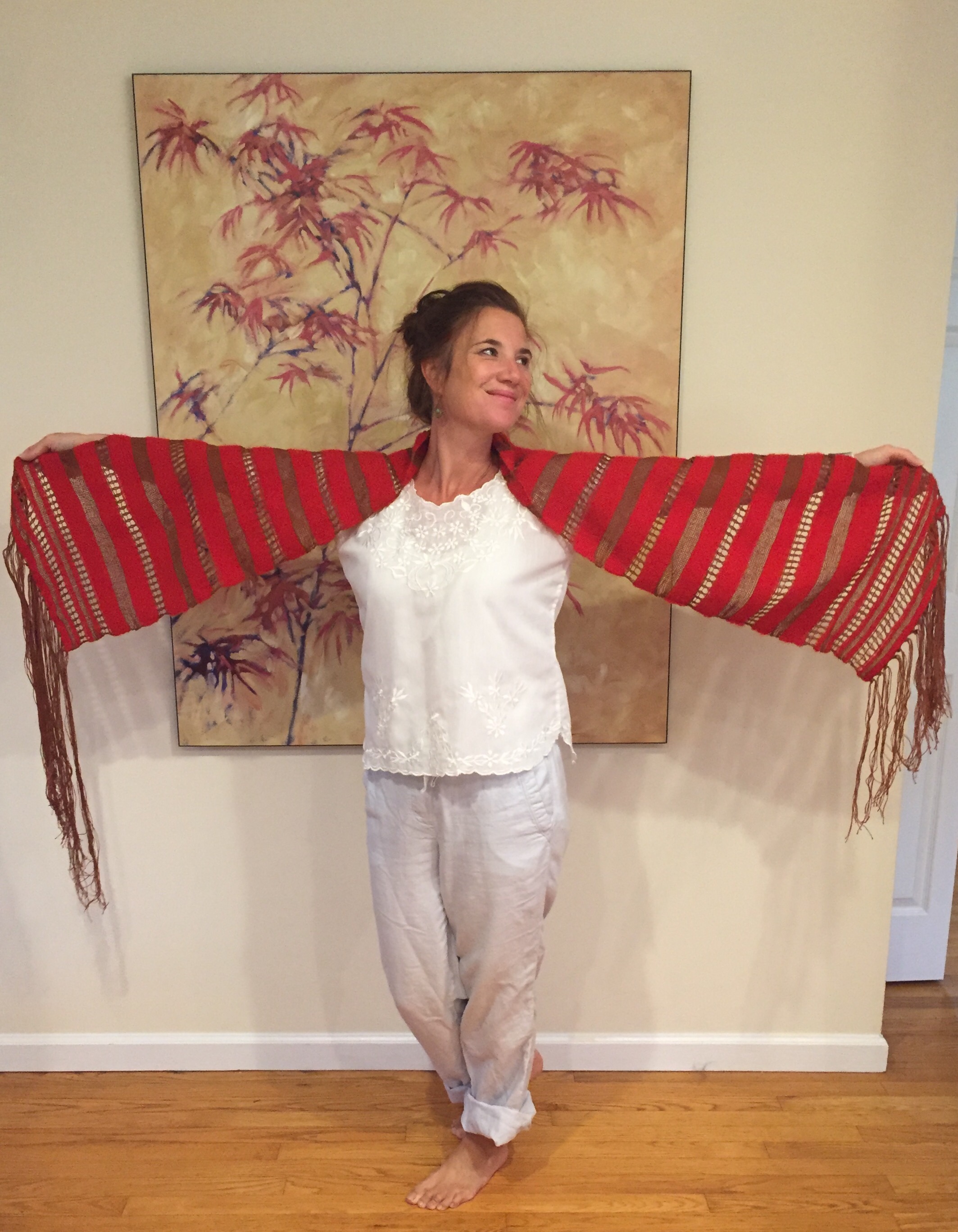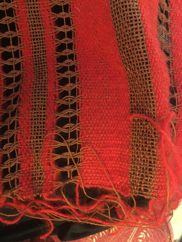 I used a yummy mohair yarn and what I’m fairly certain is a kind of thick cotton thread. I love autumn-esque colors. I was going for a shawl that both looks warm and delicate, airy and solid. I also wanted to practice a weaving technique called Leno as described in the book, Inventive Weaving on a Little Loom, by Syne Mitchell.