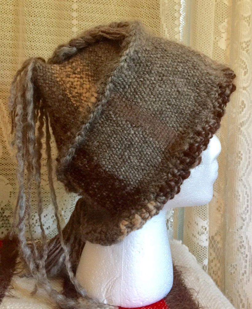 I crafted a hat out of a woven piece from the above loom and crocheted the top. It’s weird and unique and fits beautifully.