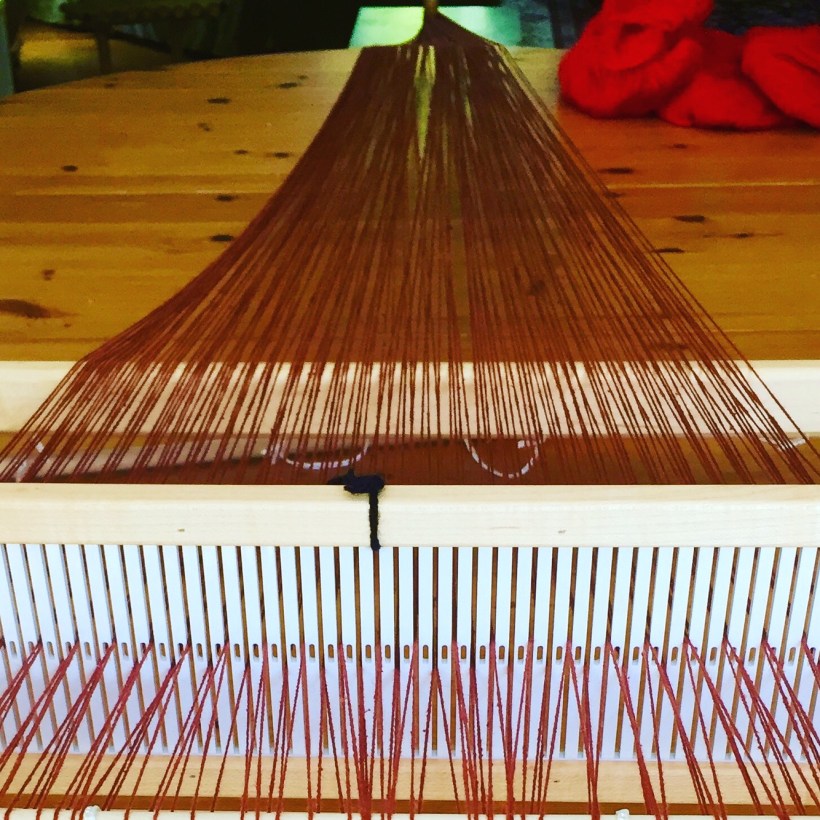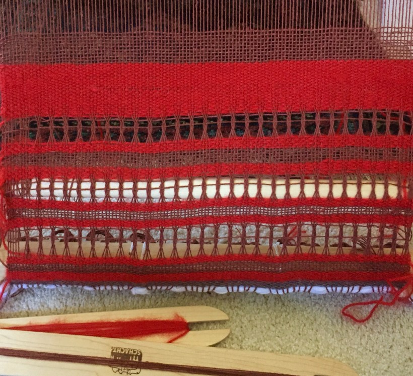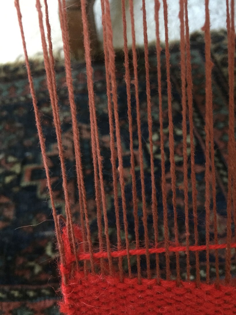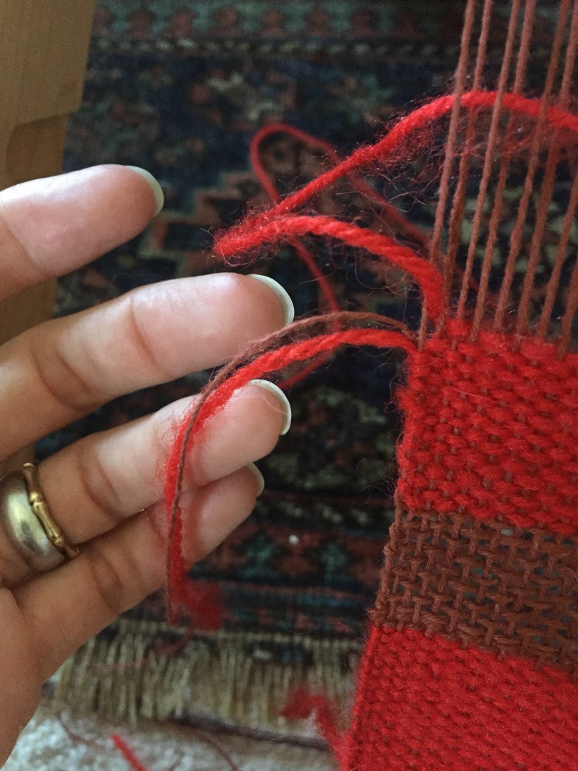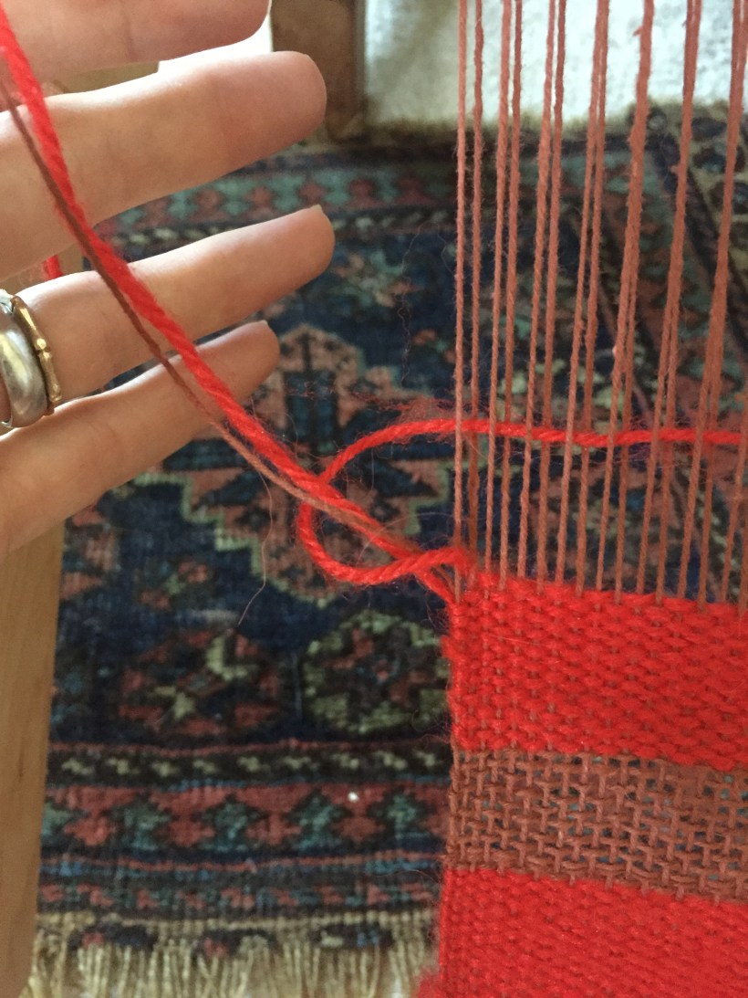 When I had to switch colors (according to my own pattern; I’d arrange the color changes much differently if I were to make this again) I tried securing the loose threads in the loop of the weft as it was going back through the warp. That worked out pretty well. Wish I’d have figured that out sooner!