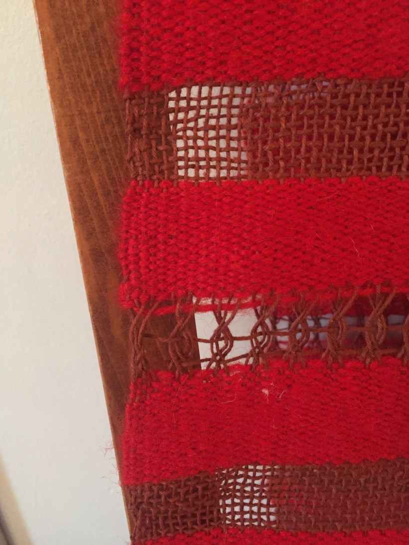 I used a yummy mohair yarn and what I’m fairly certain is a kind of thick cotton thread. I love autumn-esque colors. I was going for a shawl that both looks warm and delicate, airy and solid. I also wanted to practice a weaving technique called Leno as described in the book, Inventive Weaving on a Little Loom, by Syne Mitchell.