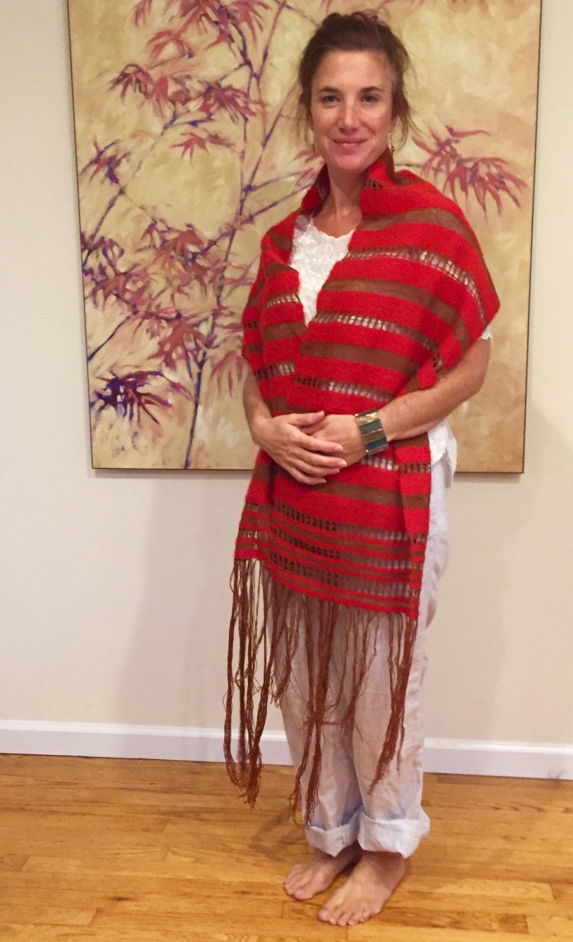 What a fun post and project (you laughed! you cried!) I can see why that had you worried but it turned out fabulous! The leno is such a nice accent and the combination of yarns and lacy/close weave is really intriguing. And fun to see the photo of you, too!