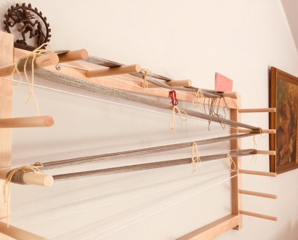 It’s that devotion that had me untangling a mess of yarn in humid heat today. It’s that tending to that had me sitting next to my loom, solving what continues to be a personal riddle~ getting the warp onto the loom without too much disarray! When will I stop sweating with anxiety when I go to take the warp off the warping board?