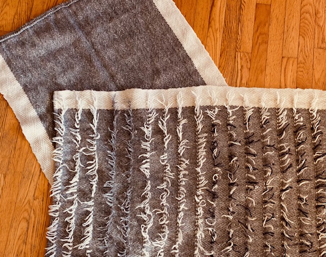 I did finish the Slitrya blankets! This was a process and it took me forever! Tying all those rya knots was no joke. I also keep meaning to go back and read the pattern again; I went wrong somewhere in my following of directions because I followed the pattern through and was supposed to be able to repeat it twice (I lengthened the warp to allow for that) but one time through and I had woven most of the warp (that was doubled!). I do know the yarn I used was thicker than it should have been, but something else went awry. So, I cut the length of fabric into parts and got two blankets that measured correctly, plus a little extra where I experimented with different yarns. I gave one of the blankets to my weaving teacher and friend, Lausanne, who was tickled! You know, lap blankets are rad! I used mine in my office that got a bit chilly over the winter with the door closed. Just enough warmth to make me comfortable.