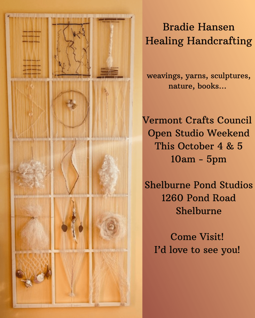 If you’re in the area and feel like stopping in, I’d love to see you! This Open Studio event is wonderful. If you haven’t participated before, there are studios open all over the state and you can pick loops that are in a region you’d like to explore. The very comprehensive maps will show you all the spots to check out. This is my second year doing it and it’s a total joy. Many thanks to the Vermont Crafts Council for putting on such a great event.