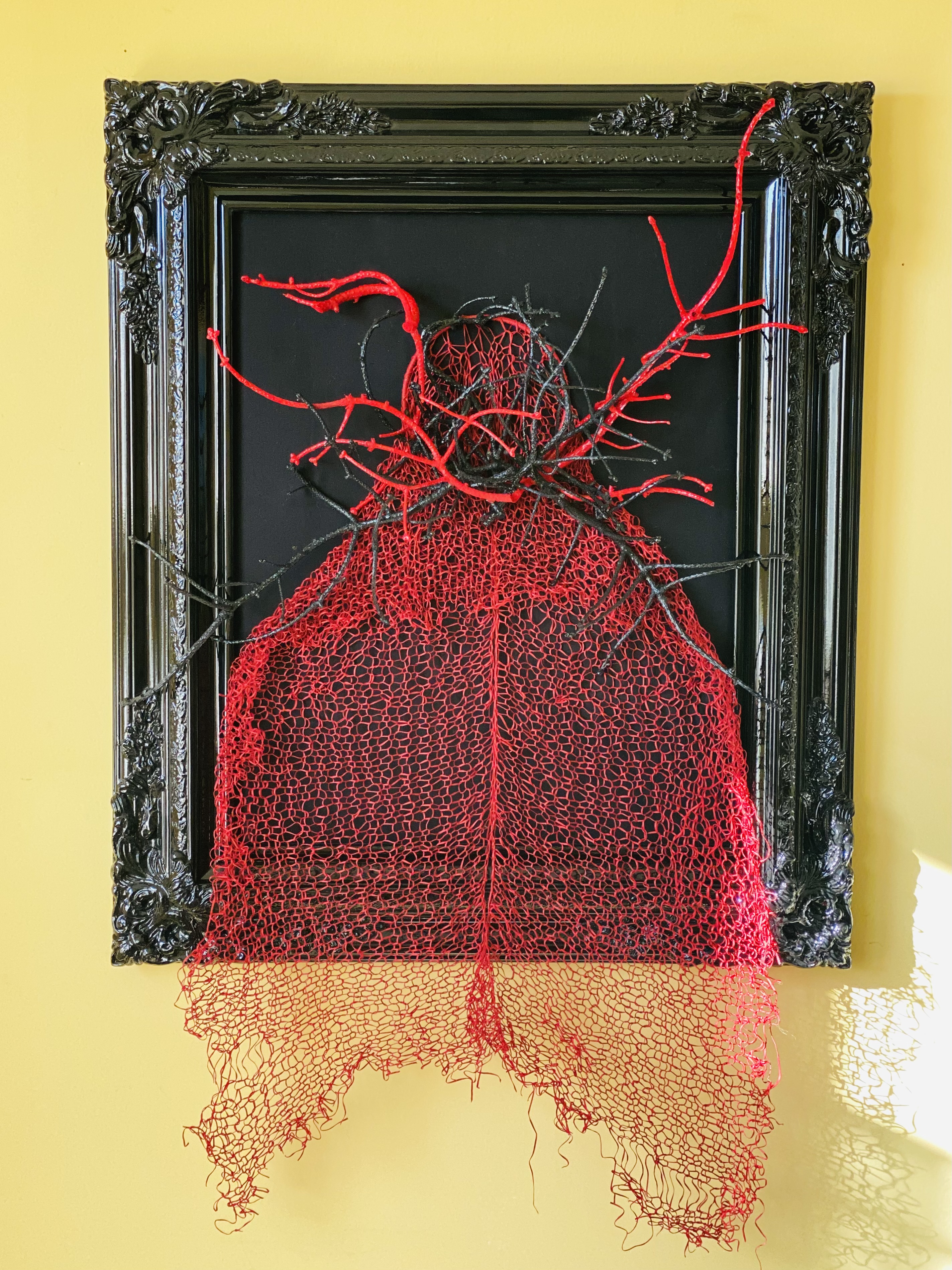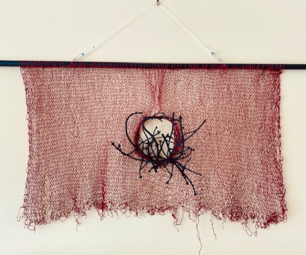 It might be clear that I was working some things out in the making of this knitted sculpture. Namely, a grief to do with the natural departure from one stage of life into the next, evidenced in part by the changing soul landscape bringing me towards menopause. Over time, I’ve learned that I do best when I wrestle with matters of the heart/mind/body through my hands. Maybe writing, maybe drawing or weaving… in this case, knitting with gorgeous deep red cotton thread, strong and soft at the same time, and engaging with a plant called Witches’ Broom, parasitic in nature, that you find on trees and bushes. Witches’ Broom is an abnormal growth of branches in the tree, usually signaling some kind of distress.