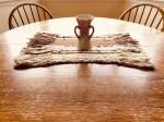 I opted for making a very fringy piece. Rather than moving back and forth and back and forth with the yarn, leaving no fringe on the edge, I chose to cut lengths of yarn that were several inches longer than the width of the cookie sheet. I wove each thread individually and then made sure that the remaining yarn was about equal on each side. If you don’t want fringe, just keep weaving back and forth with a long length of yarn, being sure not to pull too hard on the warp threads as you come back the other way.